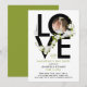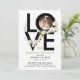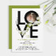 This modern Valentine's Day party invitation features a bold, black script spelling "Love," beautifully decorated with a delicate garland of white flowers and green leaves. Inside one of the letters, there’s a couple’s photo, adding a personal touch to the design. The back of the invitation is a vibrant, bright green, enhancing its festive appeal. This elegant invitation can be customised for other occasions as well, such as a wedding anniversary, birthday, Easter, or any special celebration. With its romantic floral accents and customisable features, it’s the perfect way to invite guests to a memorable event full of love and joy!