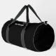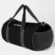 You can edit the text on this black duffle bag to show your custom message. The text is white.