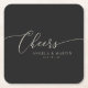 These simple 4" x 4" -50pt. pulp board square coasters feature the greeting, "Cheers," with place holders for the wedding couple names and wedding date in cream letters on a black background.