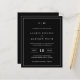 Simple budget wedding invitation featuring a modern yet elegant design with your two letter monogram at the top, a bold date layout and your details surrounded by a thin border. All design elements are in white over a black background and may be changed in the design editing tool. A chic and stylish design that is great for a minimalist couple.
