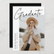 Modern graduation announcement card featuring one of the graduate's photos on the front with "Graduate" in a black handwritten script with a white background. Personalise with the graduate's name, school name, and graduation year. The minimalist graduation announcement reverses to display 4 photos in a grid-style layout with the graduate's future plans or other custom text shown below. The 5 photo graduation announcement is perfect for both high school and college graduates.