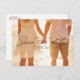 This minimalist photo save the date features casual script and a large photo. On the front of the postcard, "Save the date" is written in black calligraphy. The couple's names are placed above the script, and the wedding date and location are written below the script. The black text overlays a full-bleed horizontal photo (landscape orientation). Additional wedding details (including the wedding website) can be added to the back of the postcard.