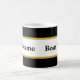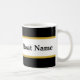 A black stripe is at the top and bottom. In the middle, there's a white stripe with black display text. You can edit the text to show your boat's name or a custom message. The faux gold stripes are not made of foil.