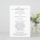 Simple wedding program with a clean and minimalist design featuring an elegant touch with the word "welcome" in script with swashes. A modern black and white design that coordinates beautifully with any style of wedding. These cheap wedding programs are printed on sheets of paper for a budget friendly option.
