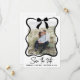 The background is white on both sides, and all artwork and fonts are black for a clean, minimal look. The back includes a short request to save the date, the location, and “formal invitation to follow,” written in a mix of handwritten and script fonts. Available as a printed card or a digital file you can send or print anywhere.