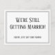 The front has a cheerful message declaring your news. "We're Still Getting Married!" Then, in smaller type, "(We're Just Not Sure When)". Accented with two slim borders, this text appears on a plain white background you can change to any colour you prefer. The reverse side includes template placeholders for your details. Use these fields to add your personal details and change my draught wording to suit your needs and situation. Fully customisable, you are able to change your colours, fonts, sizes, and especially... your message.