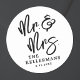 These custom round stickers feature a clean, all-white background with “Mr. & Mrs” in large black handwritten script at the center. Directly below, the couple’s last name and wedding date appear in classic black serif fonts, creating a timeless and balanced look.