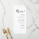 Designed for a modern and elegant tablescape, this black-and-white wedding menu showcases a refined and minimalist aesthetic. Featuring clean lines and easy-to-read text on a crisp white background, it beautifully presents your carefully curated menu selections. A stylish yet practical addition to your reception, this versatile design complements a variety of wedding themes, from classic to contemporary, ensuring a sophisticated dining experience for your guests.