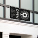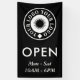 Open for business outdoors banner in black you can personalise with your business logo. Open beneath in big white letters. Open banner for outdoors use personalised with your small business logo and your opening hours.