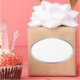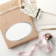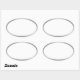 This white sticker has a faux (not foil) silver border. The sticker and the border are in the shape of an oval.