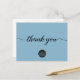 The design features a modern "thank you" script with elegant long-tailed embellishments, adding a touch of sophistication and style to the postcard. Against a calming blue background, the card exudes a sense of serenity and appreciation.