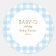 Simple blue gingham baby shower circular sticker.