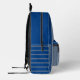 Blue grey backpack featuring a simple design with a few stripes. Add your custom quote.