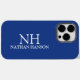 Modern phone case featuring a simple and minimal blue design with your monogram in a bold font along with your name.