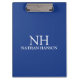 Modern business clipboard featuring a simple and minimal blue design with your monogram in a bold font along with your name.