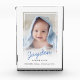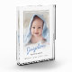 Modern baby girl birth keepsake photo block. Add your photo in the stylish white frame. Your child's first name can be added in blue script font. The child's middle and last name and birth stats follow. Elegant and simple design.
