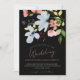 Simple Boho Black and Pink Floral Wedding Invitations - Elegant Botanical Design with Pink Script Typography. Announce your wedding in style with our modern boho invitations showcasing a captivating blend of blue and pink flowers, complemented by lush greenery on a striking black background. The elegant botanical design is accentuated by the use of pink script typography, adding a touch of romance and sophistication. With a minimalist aesthetic, these unique invitations perfectly balance modernity and natural beauty. Capture the essence of your special day with this exquisite combination of blue, pink, green, and elegant script typography, setting the stage for an unforgettable celebration.