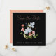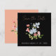 Simple Boho Black and Pink Floral Wedding Save the Date Cards - Elegant Botanical Design with Pink Script Typography. Announce your wedding in style with our modern boho save-the-date cards showcasing a captivating blend of blue and pink flowers, complemented by lush greenery on a striking black background. The elegant botanical design is accentuated by the use of pink script typography, adding a touch of romance and sophistication. With a minimalist aesthetic, these unique save-the-date cards perfectly balance modernity and natural beauty. Capture the essence of your special day with this exquisite combination of blue, pink, green, and elegant script typography, setting the stage for an unforgettable celebration.