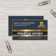 The gold motif houses your job title "chauffeur service". Just below this is a slogan to publicise your services. You can change the caption remarks to the job title and slogan to suit your own service needs. Towards the top left corner are the business name and its contact details. A gold chauffeur logo you can use, is at the opposite right side of the card.