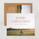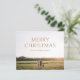 Modern minimalist Christmas card featuring a simple and minimal design with "Merry Christmas" in bold typography along with your family name in an elegant script over your favourite landscape photo. The template include a sheer gradient overlay to ensure the text is easy to read over your picture and may be removed in the design editing tool. The back has a second picture along with your personalised message in white over a boho style neutral tan background.
