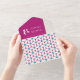 These fun all-in-one wedding invitations feature a vintage deco style design in peacock blue and magenta. Your guests can r.s.v.p with the tear off pre-addressed section. Invitation wording includes placeholders for the wedding couple names, wedding date, time, venue, venue address and reception information. The front has a flower pattern with hearts as their centres.