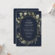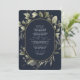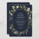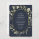 Enjoy a minimalist watercolor greenery & eucalyptus illustration over a contrasting dark navy background combined with an elegant calligraphy typography with a touch of golden colour oval. Save money by adding details and QR code on the back for your guests to rsvp.