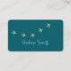 An elegant and minimalist businesscard for a travel agent... with script name and small faux gold (ochre colour) aeroplanes flying... printed on dark teal blue background.
