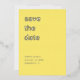 Simple Butter Yellow Save the Date Foil Invitation, please personalise the front of the Save the Date with the names of the couple getting married, the date of the wedding and the location of the wedding (or other wording of your choice), using the online personalisation template before ordering. This Save the Date design features beautiful real metallic foil text on the front, in a simple stylish minimalist layout. The background for the front of the card is a butter yellow colour; the back of the card is also butter yellow. This design is quick and easy to personalise and can be used for a wedding or other type of planned celebration event such as anniversary, birthday or family reunion.