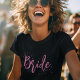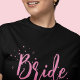This design features bride wedding pink calligraphy script, chic modern elegant simple, a minimal minimalist dots fun, bridal shower bachelorette party gift, great for bachelorette weekend event celebration, for her feminine ladies girly, trendy stylish cute typography, minimal classic clean simplistic, simple graphic novelty keepsake, for the bride t-shirt