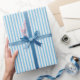 This elegant gift wrap features a simple, vertical striped pattern with a faux linen look. Candy stripes are a timeless classic, perfect for birthdays, holidays, baby showers, and everyday presents! For a traditional touch, try tying it with a rustic jute string, or adding a fancy bow for a more elegant feel! This seamless pattern gift wrap is available on premium quality paper with a matte or glossy finish. Printed colours: light blue, and white.