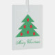 Simple Christmas Tree Green Red Merry Script Glass Ornament. Festive design with Christmas trees with red balls and snowflakes on the green. The colours are holiday red and green. You can change the text.