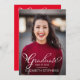 Simple and classy one photo white script text "Graduate" graduation design with back graduation party design on a red background by Holiday Hearts Designs (rights reserved) with template placeholder photo credit to Michael Dam via Unsplash.