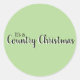 Simple Country Christmas Green Classic Round Sticker. Green background. In black with white shading are the words to the saying: "It's a Country Christmas" in two types of typography.
