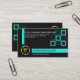 A simple card with an underlying cube and globe design. This is accentuated by two cyan stripes. Your name and job title rest in the cyan stripe at the base. Beside it, is an optional faux gold logo which you can use. Northwards near the vertical cyan stripe are your business name and contact details.
