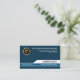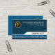 A simple design with the centre piece at the base of the card being the main object of attention.  Your name rest in a white trapezium. Right below is a light blue rectangle which houses your job title and further down the line, your contact details. All this in a creamy blue background. Directly above you have the business name and its address with its faux gold icon logo beside it.