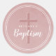 A simple baptism or first holy communion sticker design by Stacey Meacham featuring a minimal cross on a soft watercolor background. Perfect for use as an envelope closure or as a favour sticker.