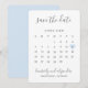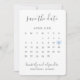 Modern save the date card featuring a simple calendar in soft grey with the words, "Save the Date" and your names in an elegant handwriting font and a pastel blue heart surrounding your date, over a white background. The backside is a matching shade of blue. DESIGN TIP: For a column that does not have a date in the first row (week), add a space before the first number. If you need any assistance with customising the calendar, please feel free to reach out to me via the "contact" button.