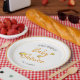 Simple baby shower party paper plate with customisable name and date text. This tableware plate is matched with the "Mummy to Bee" design theme in yellow orange script typography featuring hand-drawn honeybees in different sizes, giving the simple design a sense of movement and flow. Perfect for a garden-themed baby boy, baby girl, or gender-neutral baby shower or baby sprinkle. The dark grey details text matches perfectly with the honey orange for a cute elegance. Click on the "Personalise this template" to change all wording.