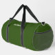 You can edit the text on this dark green duffle bag to show your custom message. The text is white.