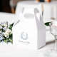 A simple modern wedding favour box design in white featuring a leafy wedding crest in dusty blue surrounding the bride and groom's monogram initials. With classic simplicity, this design features beautiful script typeface for the bride and groom's names and traditional serif typeface for the date. These elegant favour boxes are available in 3 sizes for your convenience.