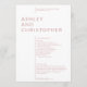 Simple minimalist wedding ceremony program stripped of extraneous ornamentation and prioritising functionality, balance and harmony. The design highlights the couple’s names as a focal point in a large isolated text block, shifting the margin for the remaining details. Clean minimalist typography. Back of card includes the bridal party and a simple memoriam details in white text on a coloured background. Available in a curated selection of rich modern colours. Design is easily customised and personalised. Please reach out with any comments or for assistance to meet your individual need. Always happy to help! Note: Leave any text areas blank to remove or use the design tool for more specific, elaborate customisations.