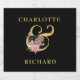 Simple but elegant, wedding couple's names along with a gold ampersand and pink floral arrangement.