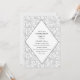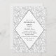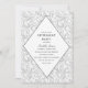 This simple yet elegant design features a light grey floral swirl pattern in the background with party details inside of a modern diamond design. All text fields are customisable.