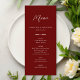 This modern, minimalist fall wedding reception menu card offers a simple clean layout on a burgundy background. The design offers space for you to add your wedding reception menu items along with the names of the bride and groom and their wedding date.