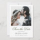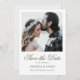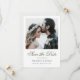 This simple, elegant modern photo wedding save the date flat card template features your names and details in a slightly softened black beneath your photo. This design looks great with either sharp or rounded corners, try both looks in editing mode to see which grabs you! We've chosen a fancy script for the 'Save the Date' part of the design. We love its flourished capital letters, lively loops and ornate flair. The default colour for the Save the Date script is an elegant medium dark shade of green. You might choose to change the font, punctuation or colour used for various text elements of this design on the front and/or back. For example, you might choose to give a different colour to your name text or to the Save the Date text, or change the SAVE THE DATE text below the photo to SAVE OUR DATE or something different. You might choose to delete something or change a text field entirely with a different message. The background on the front is set as transparent to let the colour of the paper simply serve as the base tone, but you can edit this and choose a colour if you prefer. On the back, we've chosen a background colour called White Smoke, it's a very light grey that's mostly white. You can also change this if you'd like. We've added some sample text on the back in all lower case in slightly softened black. Instead of entering your own wedding website address, you might decide to enter a different sort of message there instead. You can also change the font, text colour or use some upper case, etc. Of course you can also simply delete all of our sample text on the back and leave that side of the card totally blank, perhaps to hand write your own message later, or to send without any text on the back.The default paper type, matte, has a soft warmth to it and resists smudging, so it's a great choice for writing your own message. You can edit this and choose semi-gloss or another paper type instead. In any case, please do remember to delete all of our sample text on both sides as well as our sample photo. We hope you'll enjoy experimenting with this clean, contemporary template design and make it uniquely yours with the intuitive design tools, your favourite photo and your inspiration. We have a variation of this design with 'Save the Date' above the photo along with a selection of other modern minimalist save the date cards, so please have a look!