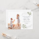 Save the date save wedding announcements featuring a simple design with watercolor greens that can be customised with a photo of the couple. Personalise with your information.