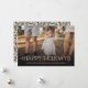 This beautiful holiday photo card features stylish, modern typography on the bottom, reading, "Happy Holidays" in ivory. A dark gradient overlay allows the text to stand out against any photo. The back of the card contains a hand drawn floral and greenery pattern in traditional colours of deep green, burgundy red, and ivory over a sand beige background (background colour can be customised, if desired).