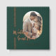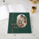 A uniquely elegant wedding guest book with real rose gold foil and modern styling on a popular emerald green background. The design features an oval photo template for including your selected photo. Wedding Guest Book text is spelled out in modern script typography and is accented with simple line graphics. Personalise the text template with your names and wedding date. The spine of this guest book also has a text template to personalise as you like. You can choose between 3 shades of gold foil: rose gold (shown here); gold, or silver.