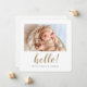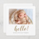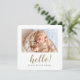 This simply stylish photo birth announcement square flat card features a contemporary look that is equally well suited to girls and boys. We've picked rounded corners as the default shape setting, but you can easily change the look to sharp corners, as that look also works wonderfully with this design. Beneath your photo we've added a simple 'hello!' in all lower case in a relaxed, modern script. We've highlighted it by making it an elegant gold tone that's sometimes called California Gold. This element of the design can't be altered. The name on the front below that is in dark grey, but when you edit our sample text to show your baby's name, you can easily also change that text colour and font to suit your style. We've set the background on both sides as transparent, to let the colour of your paper simply serve as the base tone. You can change this on one or both sides by choosing a colour instead. On back, We've included a place for your baby's full name again, also in the gold tone we used for 'hello!' on the front. When you edit this to show your baby's name, you might decide to change the colour of this text. The stats below that are set as grey, but you can also change the colour and font of this. Finally, at the bottom on back, we've added a line in script with a message of welcome and your names. This can also be edited for colour and font to suit your style, and of course you can change the wording as well. In any case, please do remember to remove all of the placeholder and sample text on both sides as well as our sample photo! The default paper type, matte, has a soft warmth to it and resists smudging, so it's a great choice for writing your own message if you choose to delete some or all of our sample text on back without replacing it with your own. Or you can change the paper type to semi-gloss or one of zazzle's other lovely styles. Use the intuitive design tools, your favourite photo and your inspiration to personalise this custom birth announcement square flat card and make it uniquely yours!