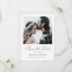 This simple, elegant modern photo wedding save the date flat card template features your names and details in a slightly softened black beneath your photo. This design looks great with either sharp or rounded corners, try both looks in editing mode to see which grabs you! We've chosen a fancy script for the 'Save the Date' part of the design. We love its flourished capital letters, lively loops and ornate flair. The default colour for the Save the Date script is an elegant gold tone called California Gold. You might choose to change the font, punctuation or colour used for various text elements of this design on the front and/or back. For example, you might choose to give a different colour to your name text or to the Save the Date text, or change the SAVE THE DATE text below the photo to SAVE OUR DATE or something different. You might choose to delete something or change a text field entirely with a different message. The background on the front is set as transparent to let the colour of the paper simply serve as the base tone, but you can edit this and choose a colour if you prefer. On the back, we've chosen a background colour called White Smoke, it's a very light grey that's mostly white. You can also change this if you'd like. We've added some sample text on the back in all lower case in slightly softened black. Instead of entering your own wedding website address, you might decide to enter a different sort of message there instead. You can also change the font, text colour or use some upper case, etc. Of course you can also simply delete all of our sample text on the back and leave that side of the card totally blank, perhaps to hand write your own message later, or to send without any text on the back.The default paper type, matte, has a soft warmth to it and resists smudging, so it's a great choice for writing your own message. You can edit this and choose semi-gloss or another paper type instead. In any case, please do remember to delete all of our sample text on both sides as well as our sample photo. We hope you'll enjoy experimenting with this clean, contemporary template design and make it uniquely yours with the intuitive design tools, your favourite photo and your inspiration. We have a variation of this design with 'Save the Date' above the photo along with a selection of other modern minimalist save the date cards, so please have a look!